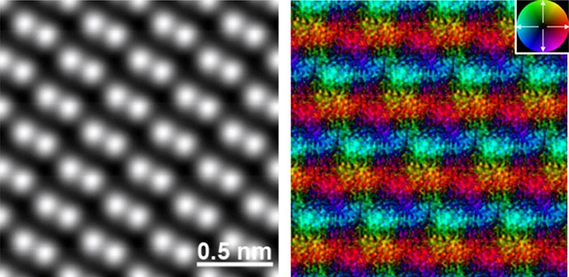 Real-space magnetic field image of an antiferromagnetic α-Fe2O3 The atomic structure image (left) and corresponding magnetic field image (right). In the atomic structure image, Fe atoms are visualized as bright spots. In the magnetic field image, the color contrast indicates the magnetic field orientation and strength. The inset color wheel indicates how color and shade denote the magnetic field orientation and strength in the vector color map. The antiparallel magnetic fields on the adjacent Fe atomic layers are clearly observed, visualizing antiferromagnetic order in this crystal. @ Naoya Shibata